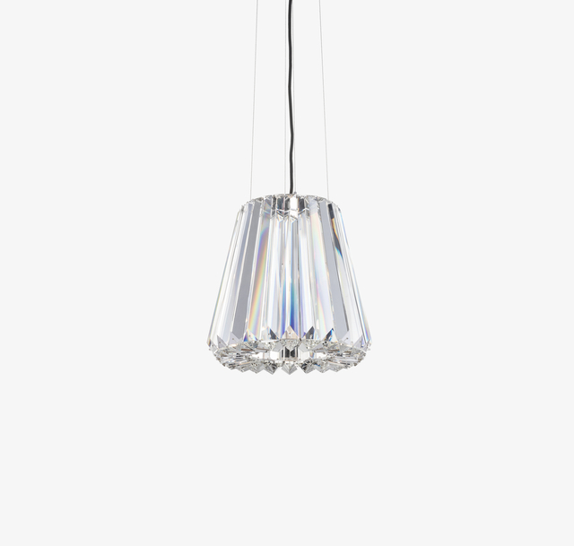Provocatively ice clear “pleated” lamp-shades with right angle cranked legs stand in contrast with the ornamental composition of shadows that appear on the walls after you switch on the light. The classical design together with an optical projection merges into a “romantic functionalism”.