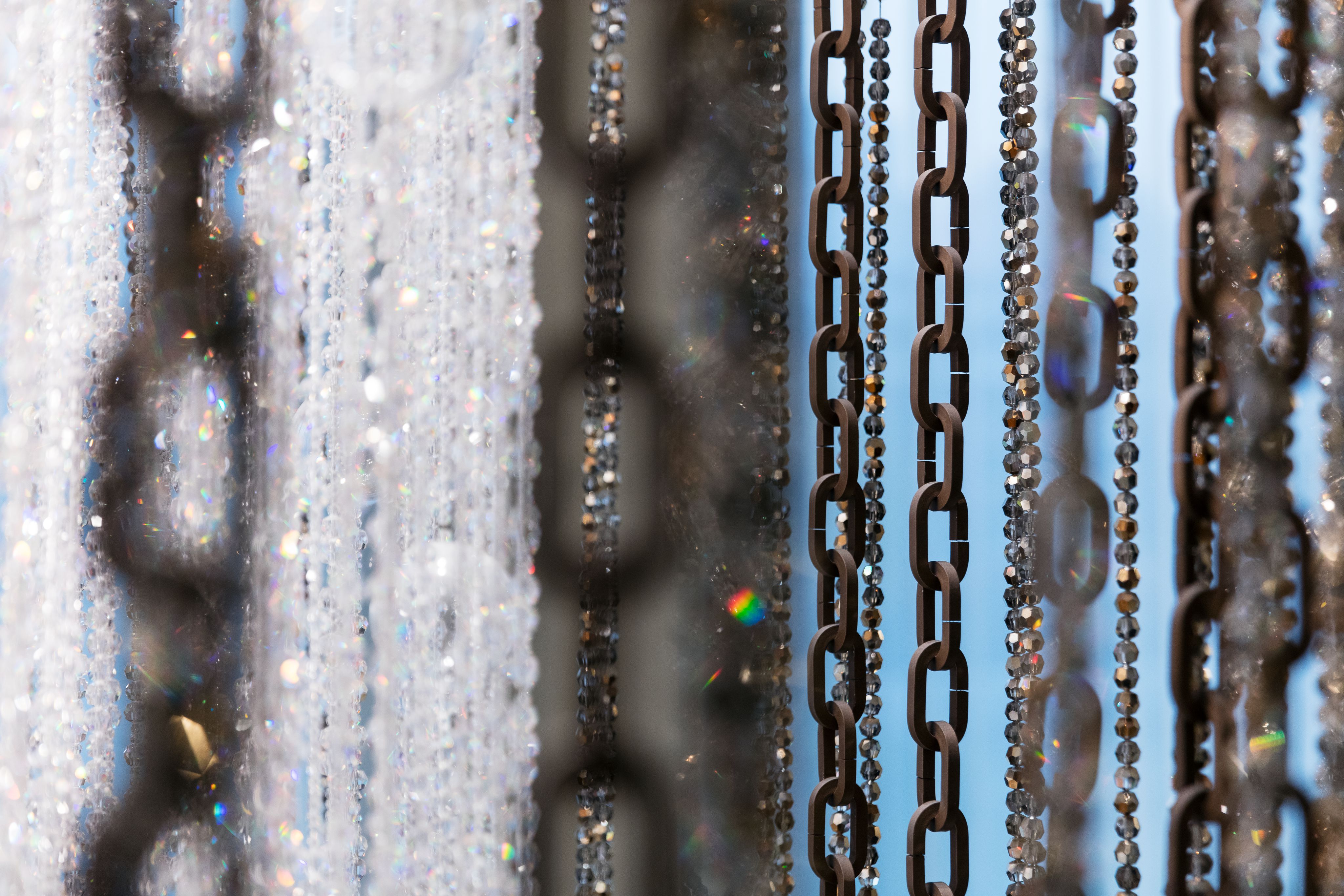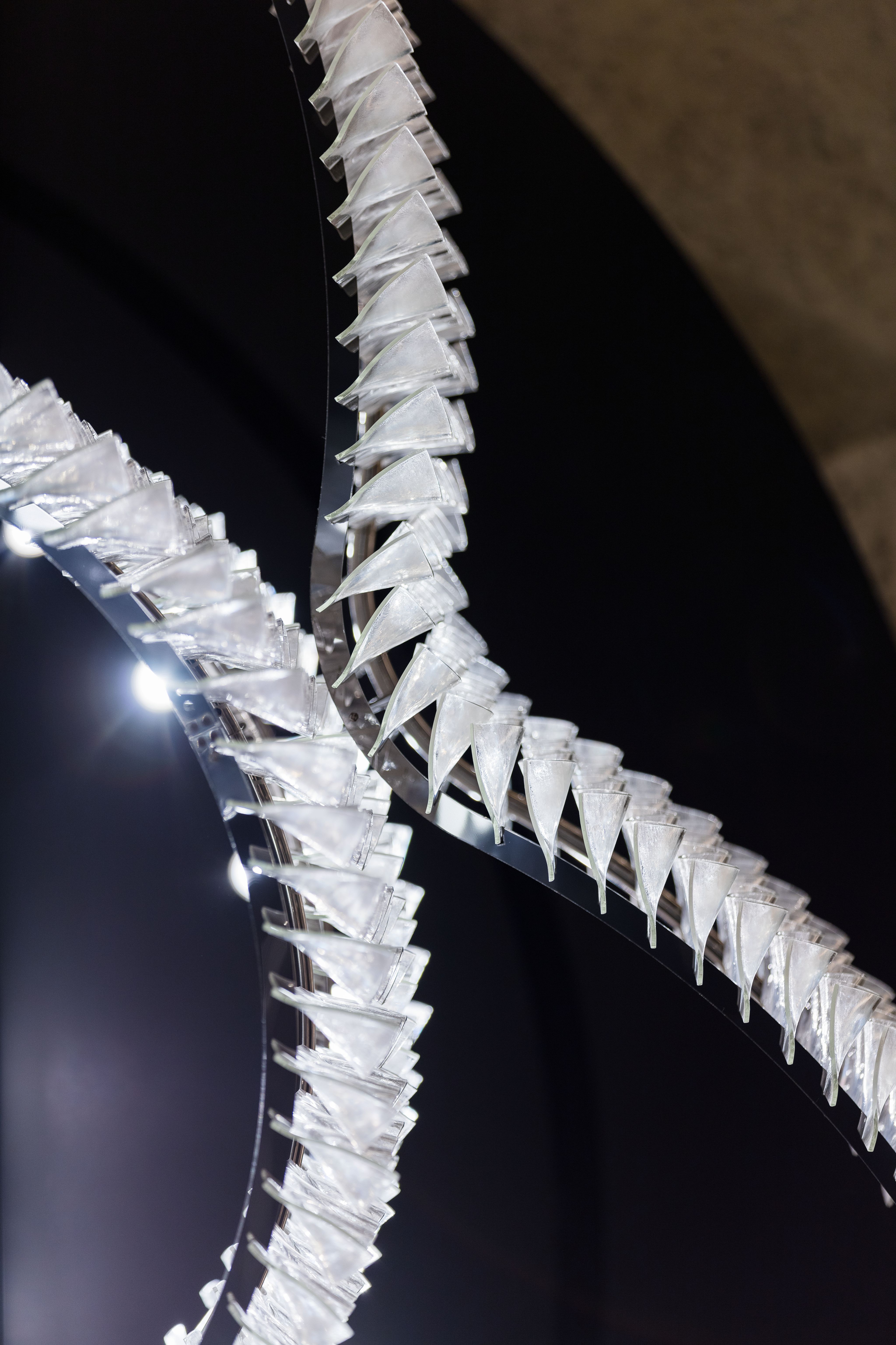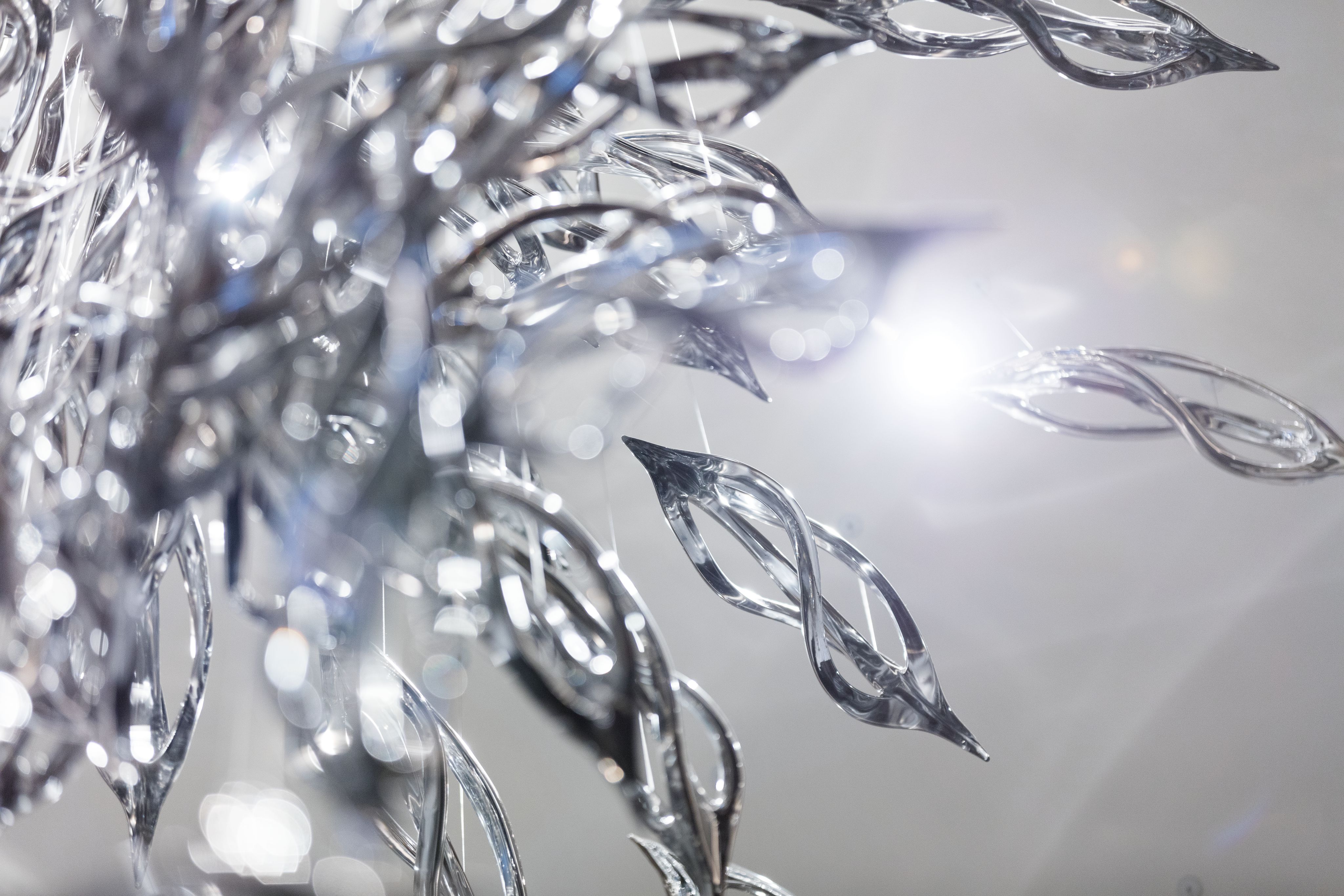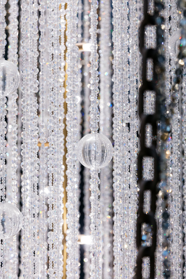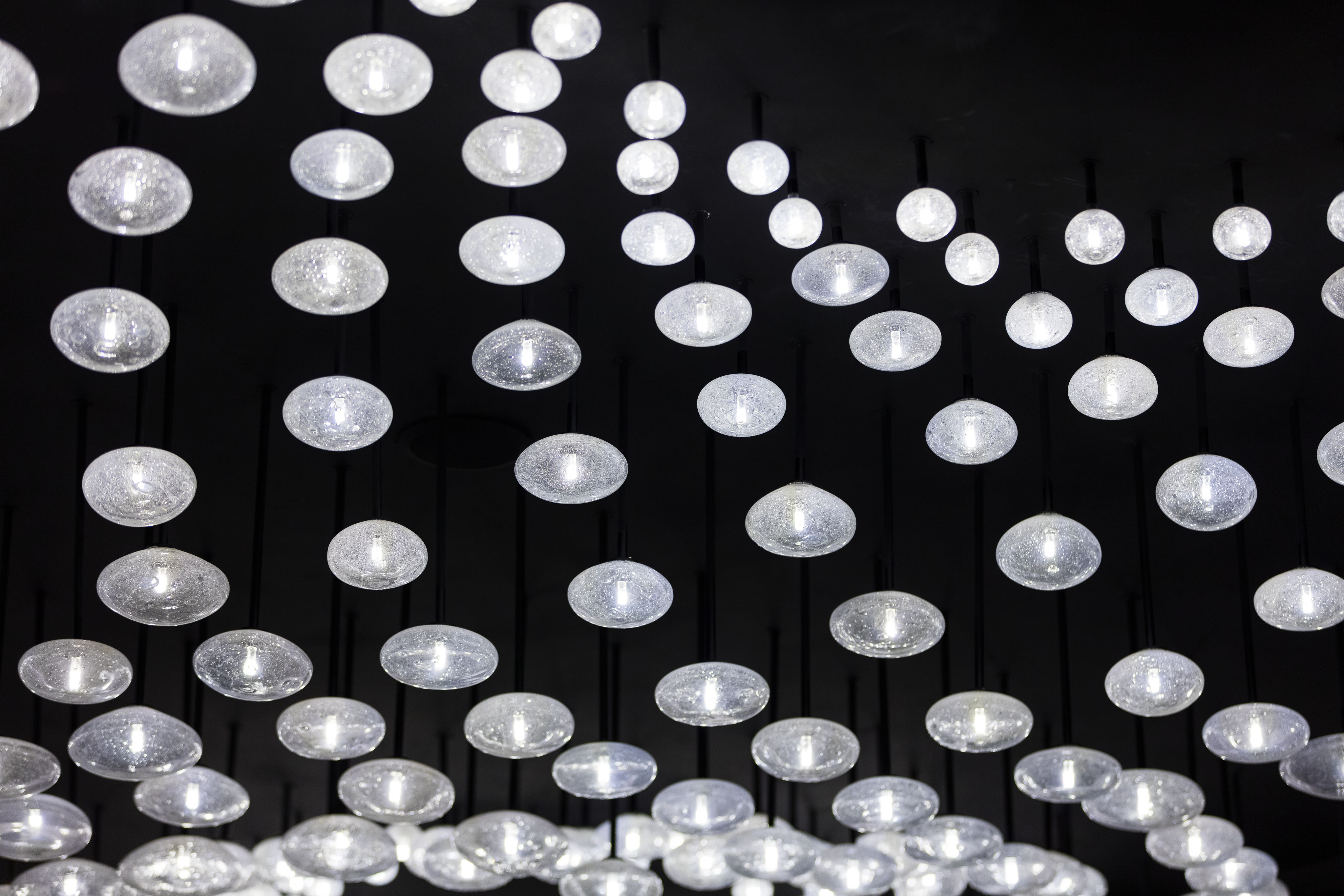 Lasvit's glass-blowers worked five months to cover the ceiling with more than 11 tons of glass. More than 1500 components in the shades of violet and pink stretches to a full 350 square meters.