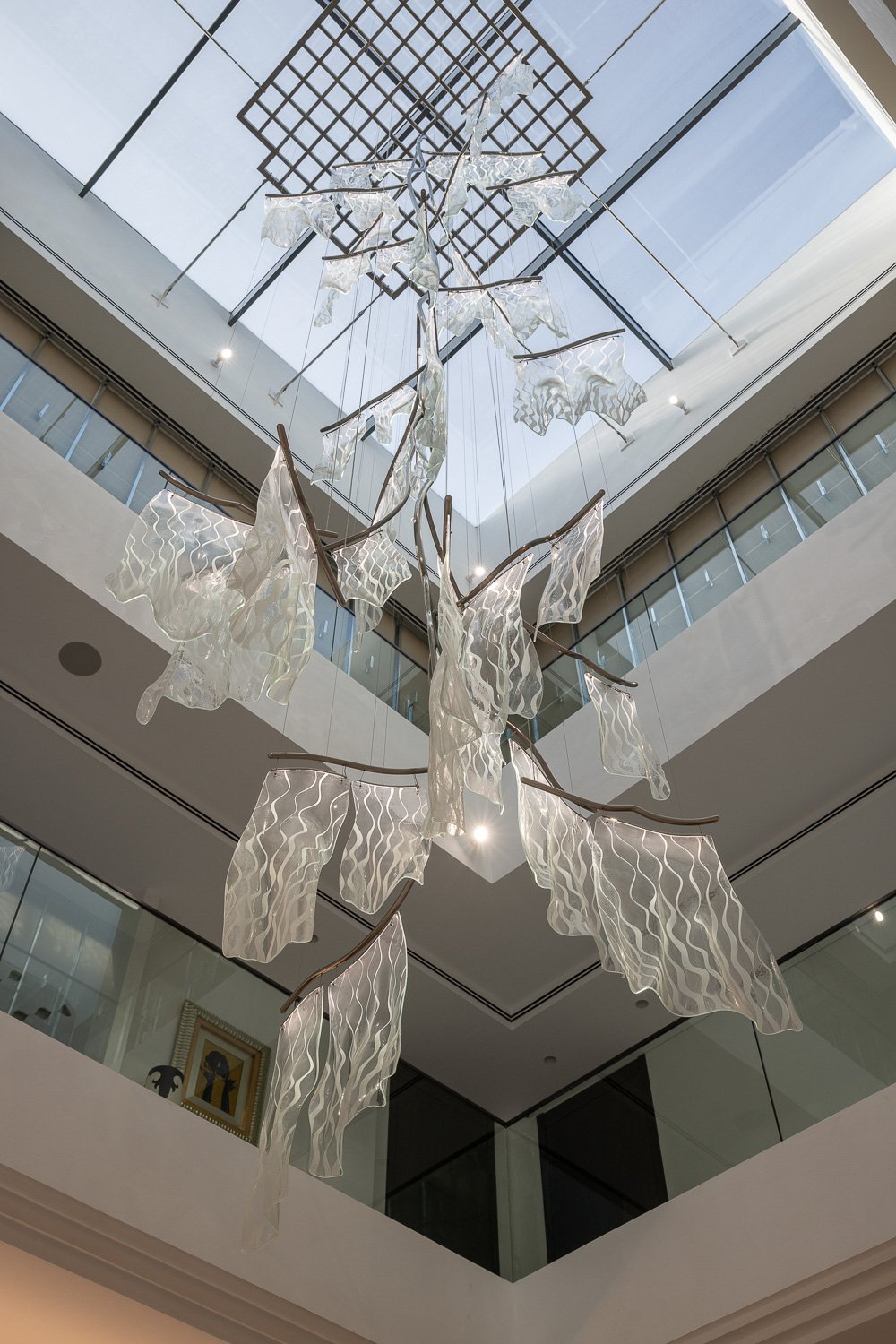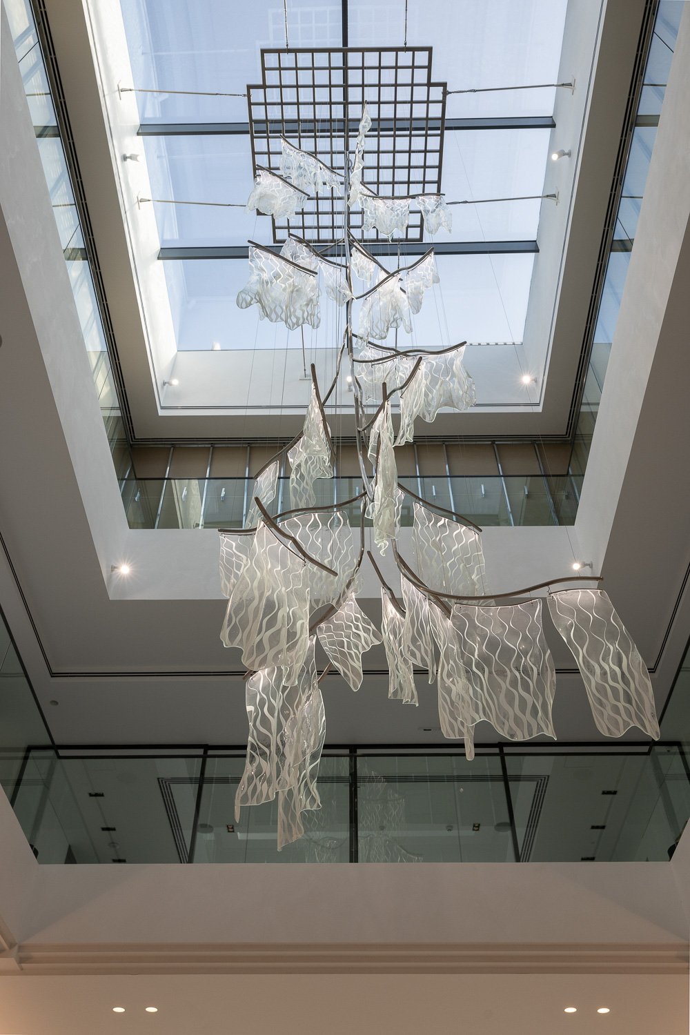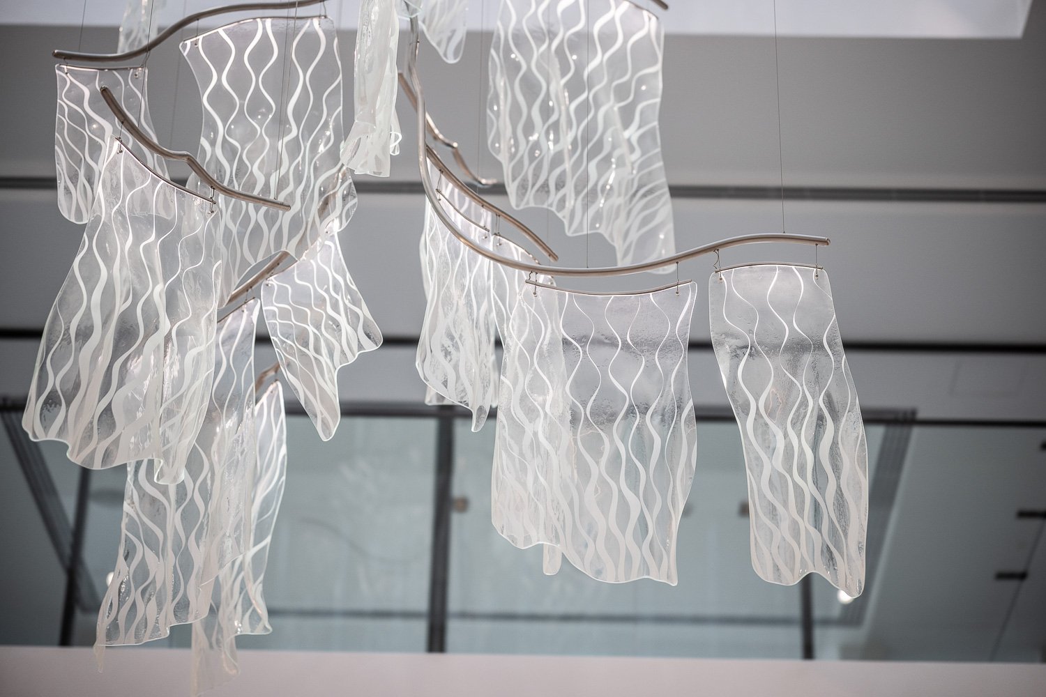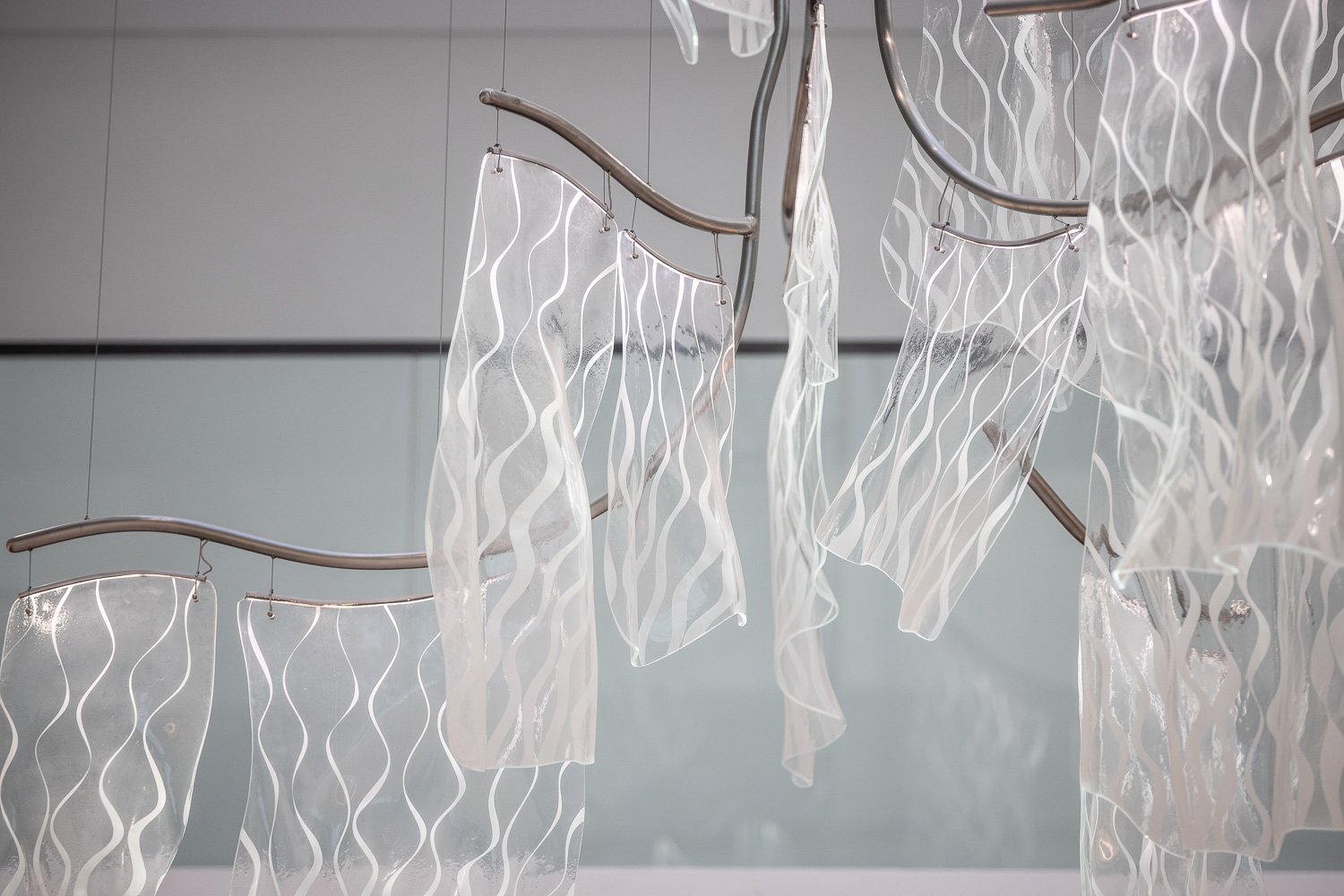 Taking its cue from that fleeting shimmer, the artwork transforms morning frost into kiln-formed glass veils, each embedded with a soft white wave. The panels are suspended from a gently curving spine and layered at varied heights. By day, the sculpture filters daylight into cascading ripples. By night, it gathers a silvery glow that feels almost alive. The piece breathes with the architecture – responsive, serene, and quietly radiant.