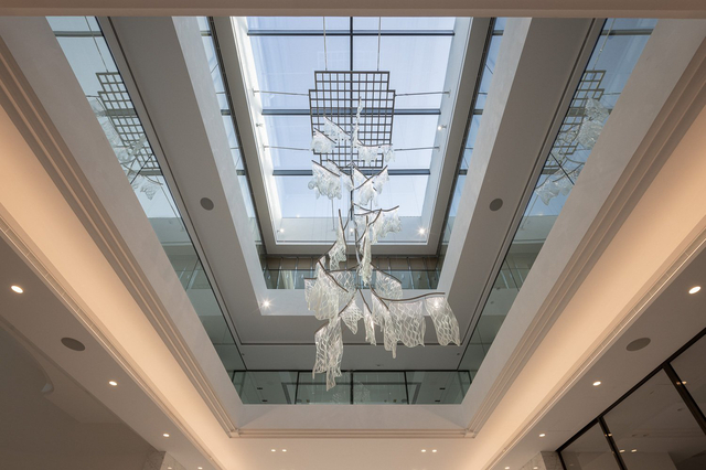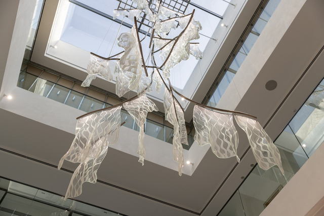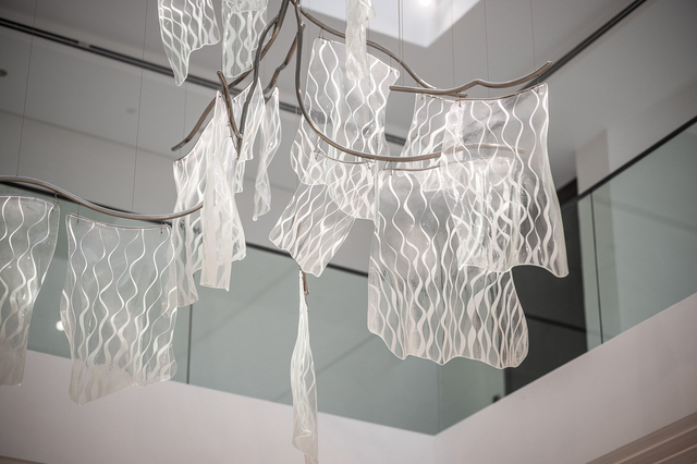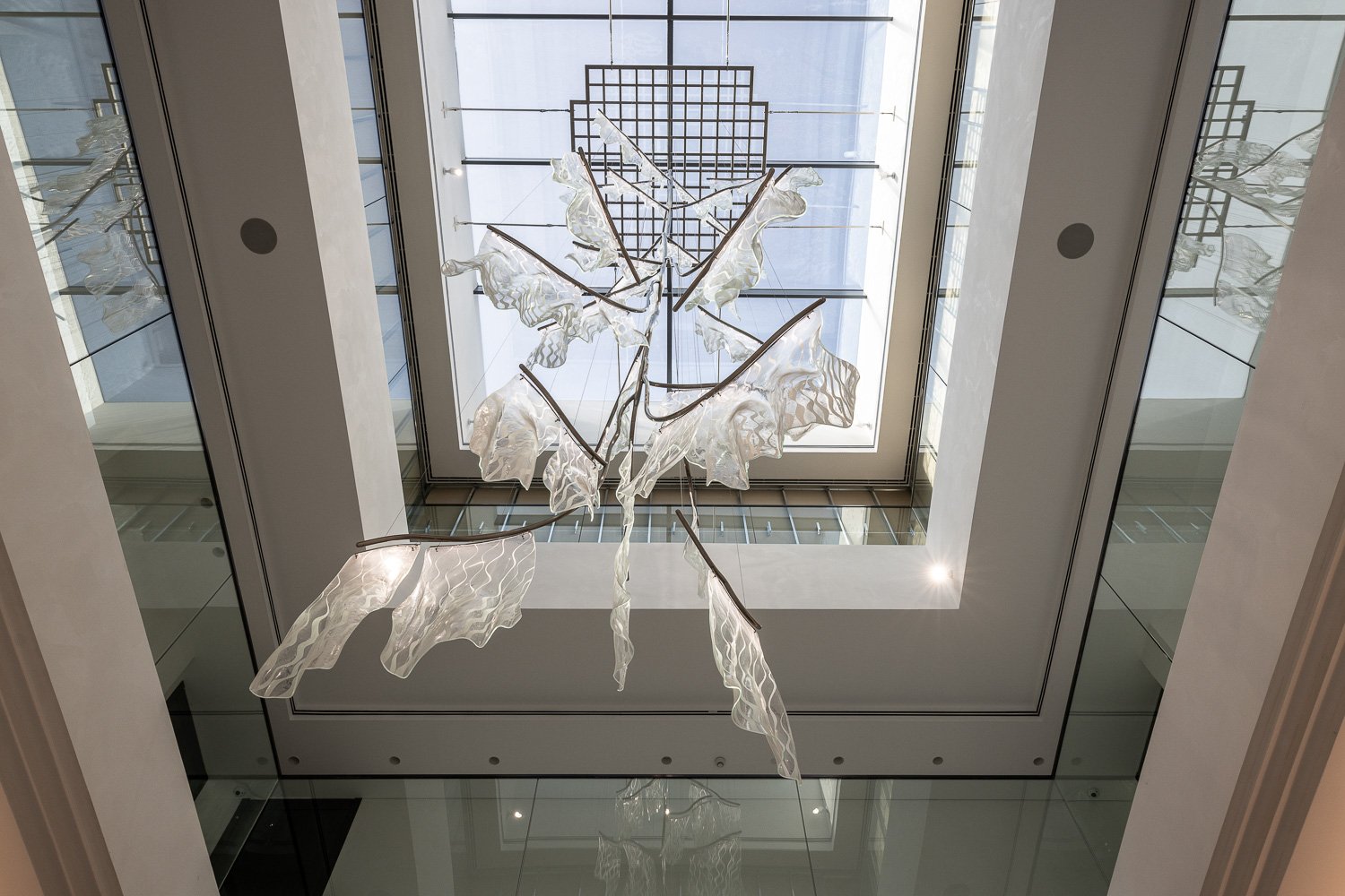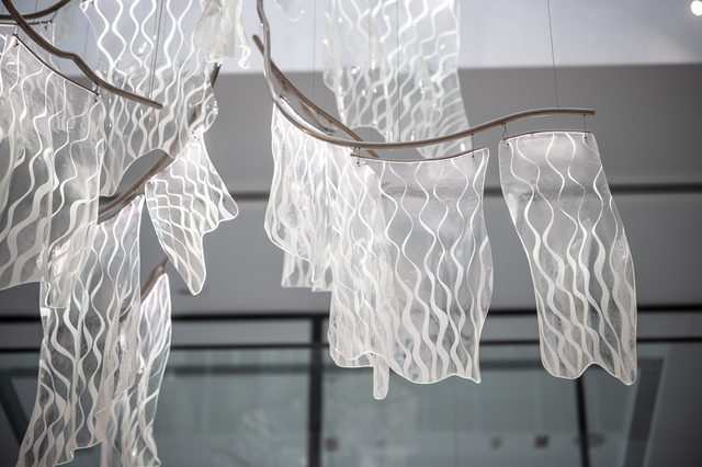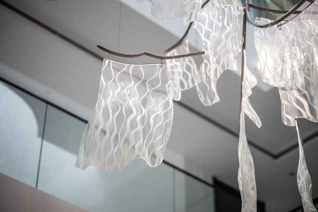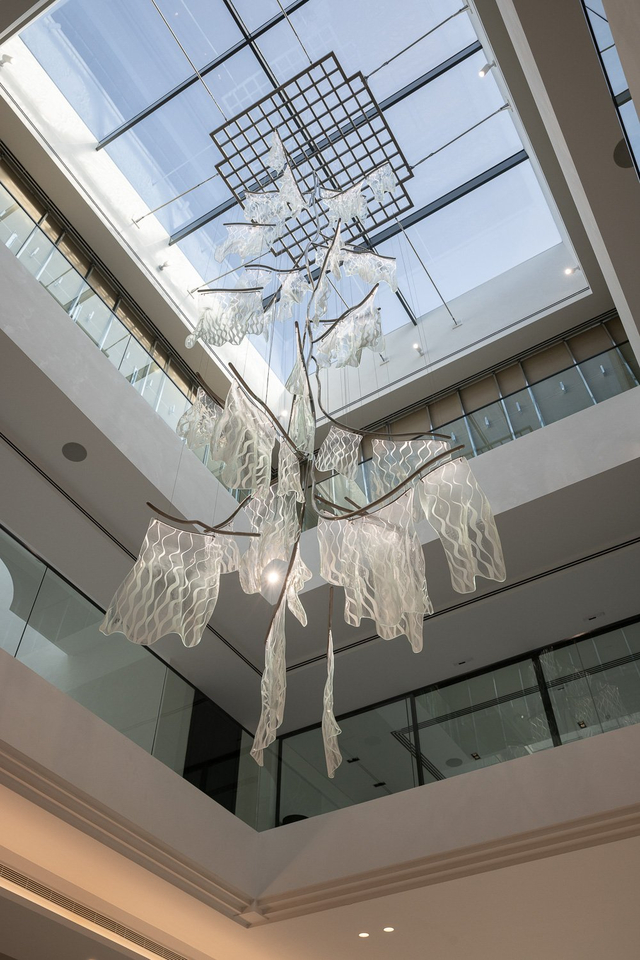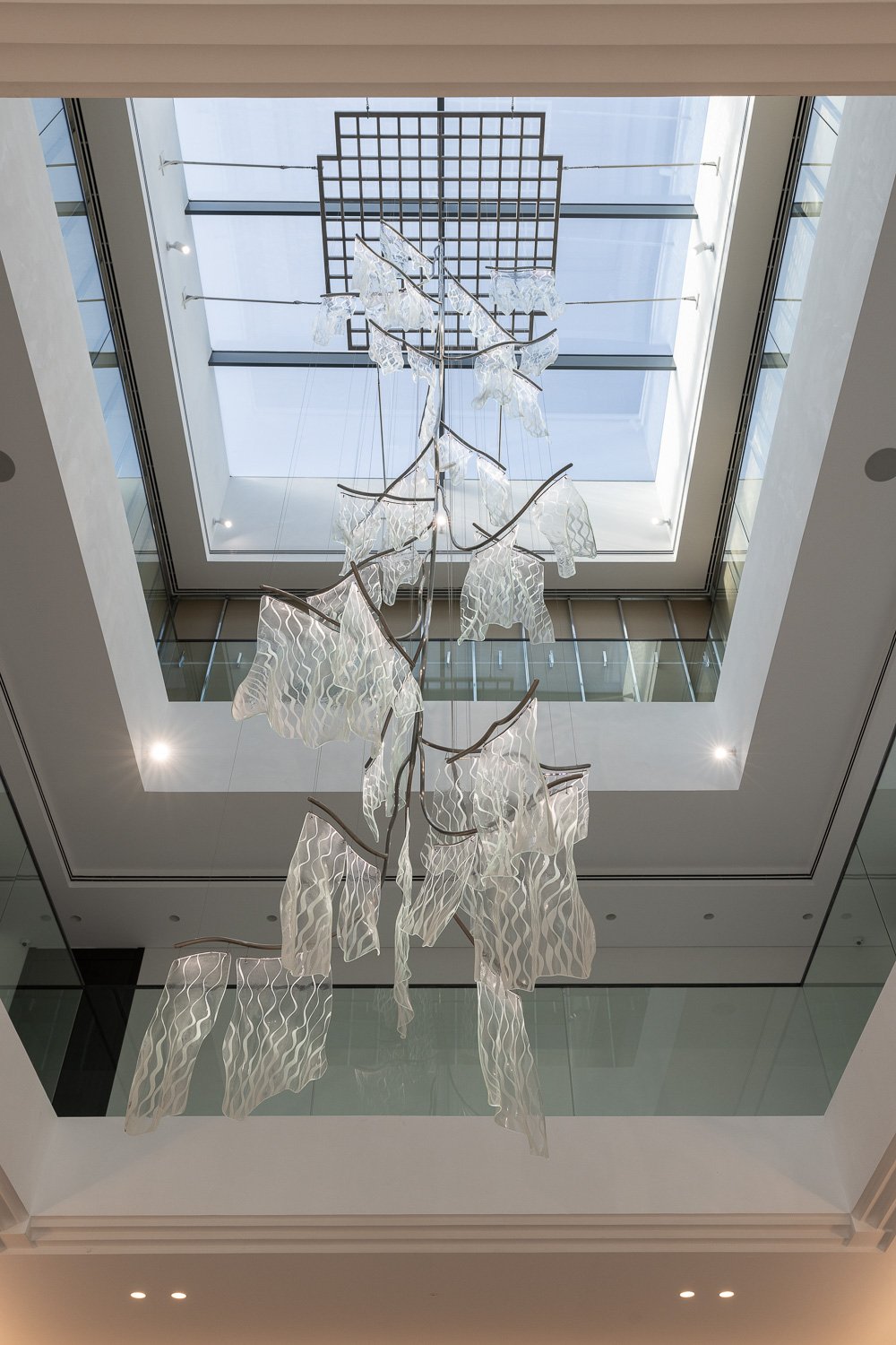 Taking its cue from that fleeting shimmer, the artwork transforms morning frost into kiln-formed glass veils, each embedded with a soft white wave. The panels are suspended from a gently curving spine and layered at varied heights. By day, the sculpture filters daylight into cascading ripples. By night, it gathers a silvery glow that feels almost alive. The piece breathes with the architecture – responsive, serene, and quietly radiant.