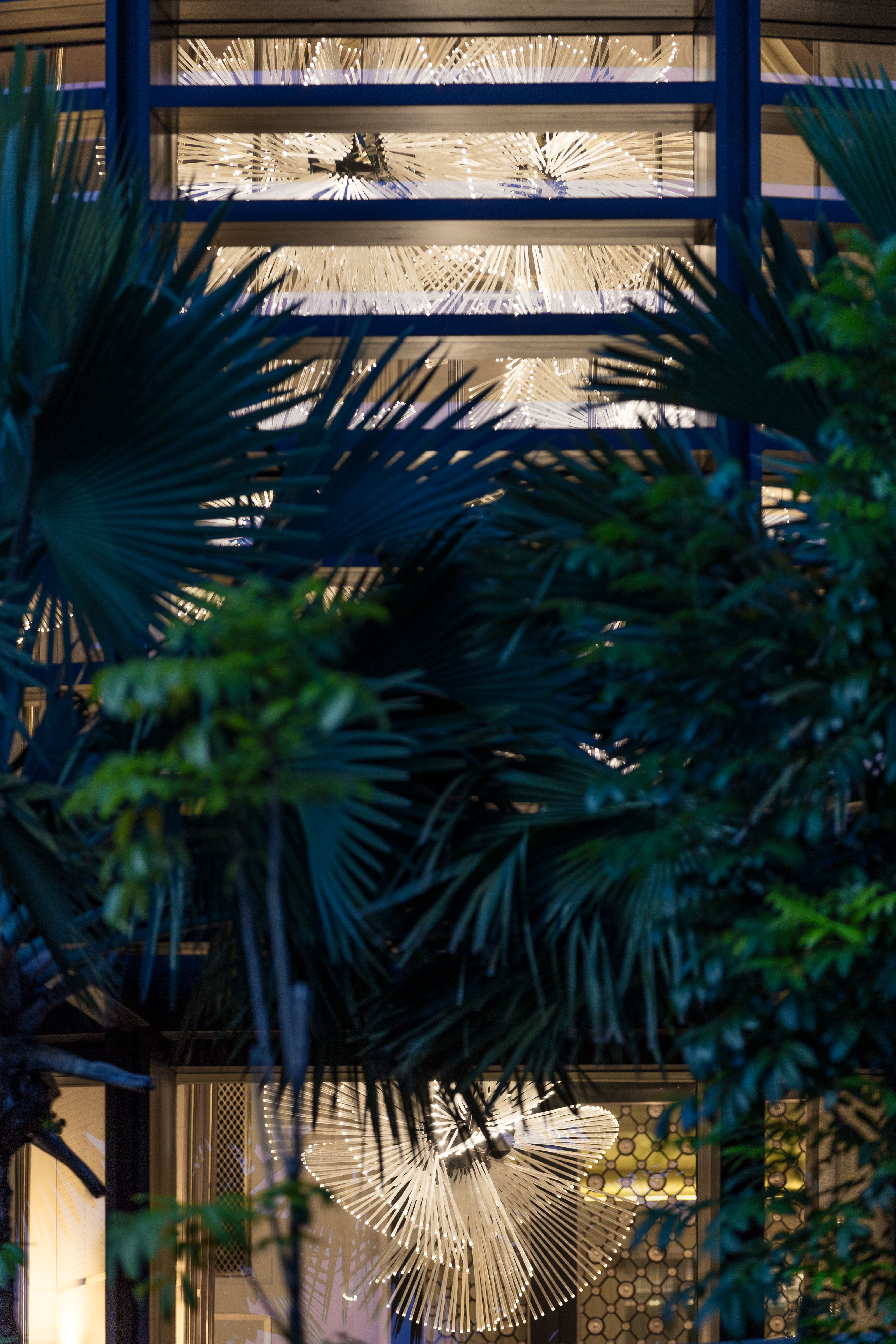 The majestic chandelier, suspended from the 13-meter (43-foot) cupola ceiling, is the first detail to catch one’s eye, as well as an element that sets the tone for the culinary experience about to take place. The lighting sculpture features 14 fan-like clusters, each up to 2m in diameter. The metal central spheres are surrounded by light-carrying glass rods.