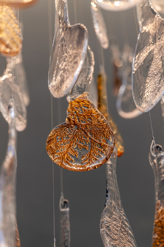 The lighting installation builds upon our signature "Herbarium" design concept. For Gerbou, the iconic Ghaff tree—a beloved symbol of the UAE—served as the central inspiration. Branches and leaves were carefully imprinted into molten glass to closely resemble the delicate structure of Ghaff foliage.