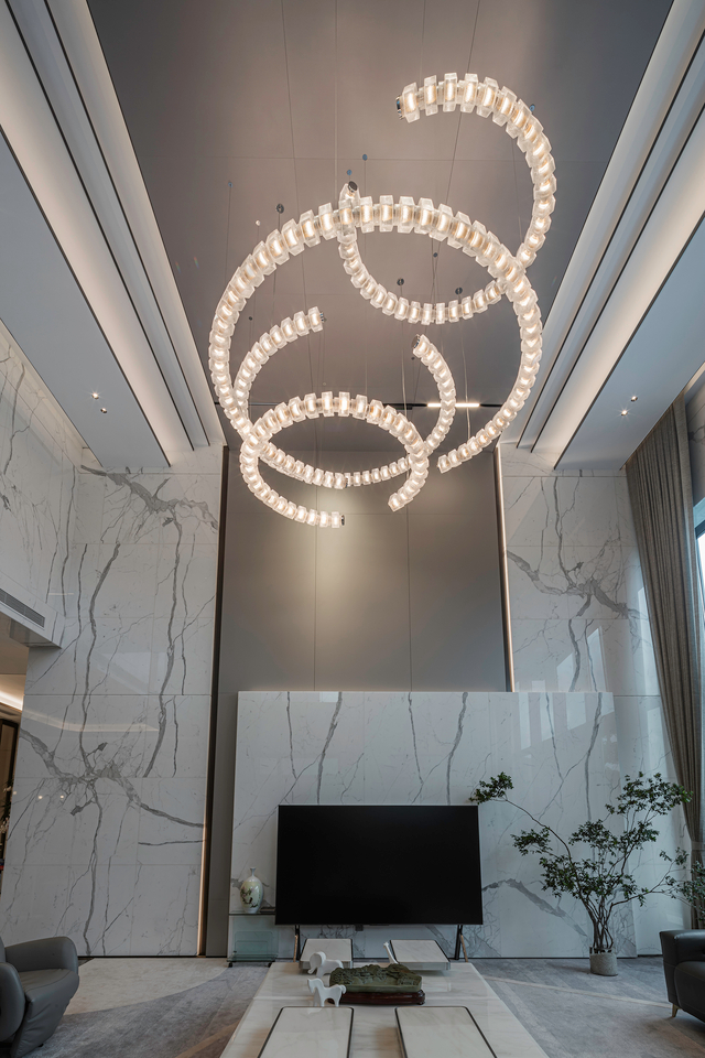 Set high above the Kau To Shan mountains, this private residence opens with a living room shaped by a luminous glass installation, reminiscent of a calm orbit in space. The design alludes to the celestial circle, a symbol of positivity. Its soft glow and measured rhythm allow the glass to gently shape the home.