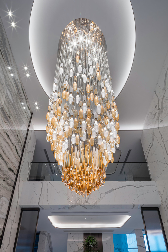 At the entrance of this private family residence in Hong Kong, a striking installation draws inspiration from the flowing nature of water, long associated with prosperity in Feng Shui. Dense elongated droplets are composed with smaller ones, all illuminated by internal LEDs, creating a sense of movement that welcomes visitors inside.
