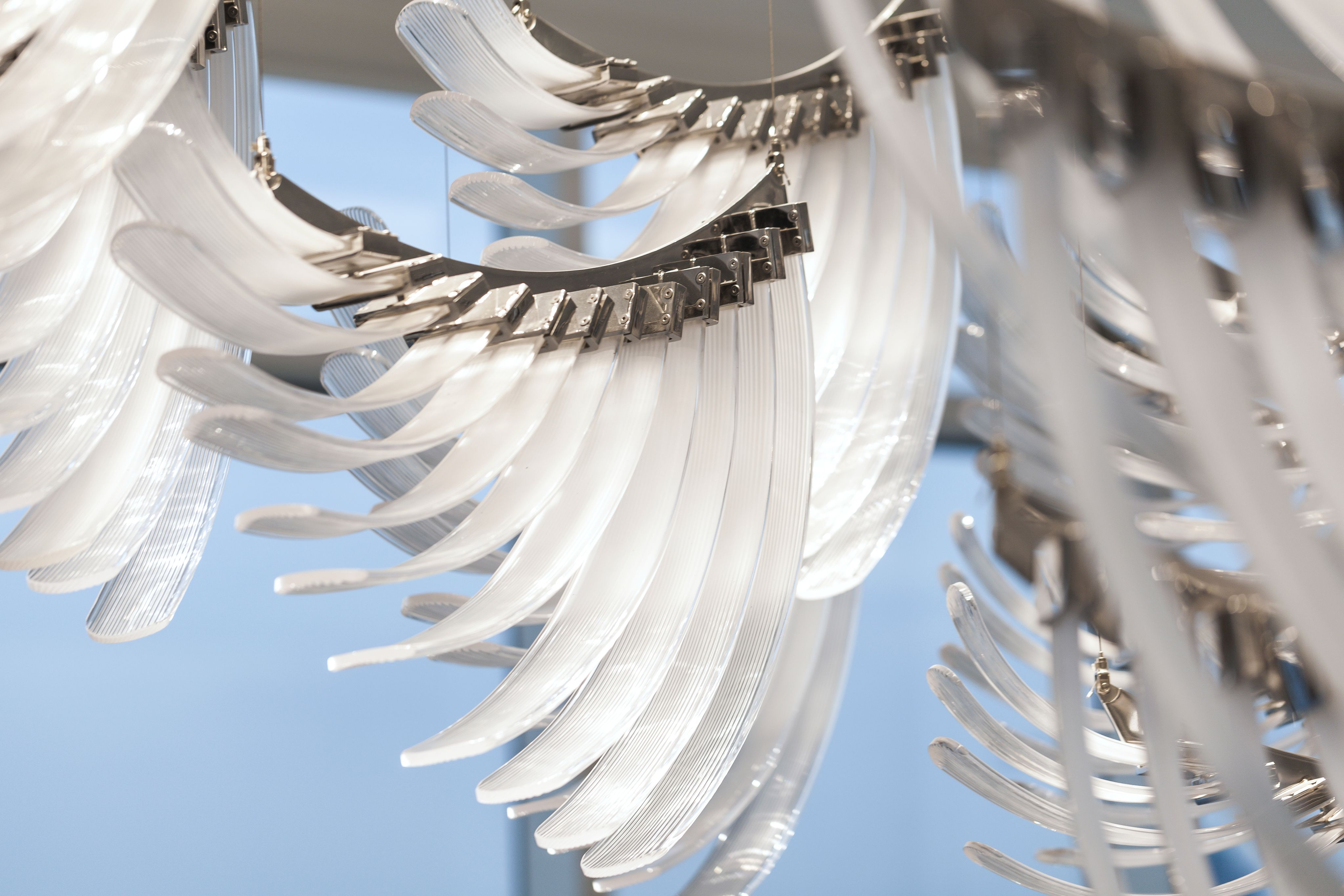Petra Krausová drew her inspiration by studying bird movement. Each gentle wing consists of 12 pieces of hand blown glass in a combination of clear and sandblasted. Twelve glass components are fixed in a way that depicts layered feathers on bird wings. Fluted texture mimics the texture of feathers.