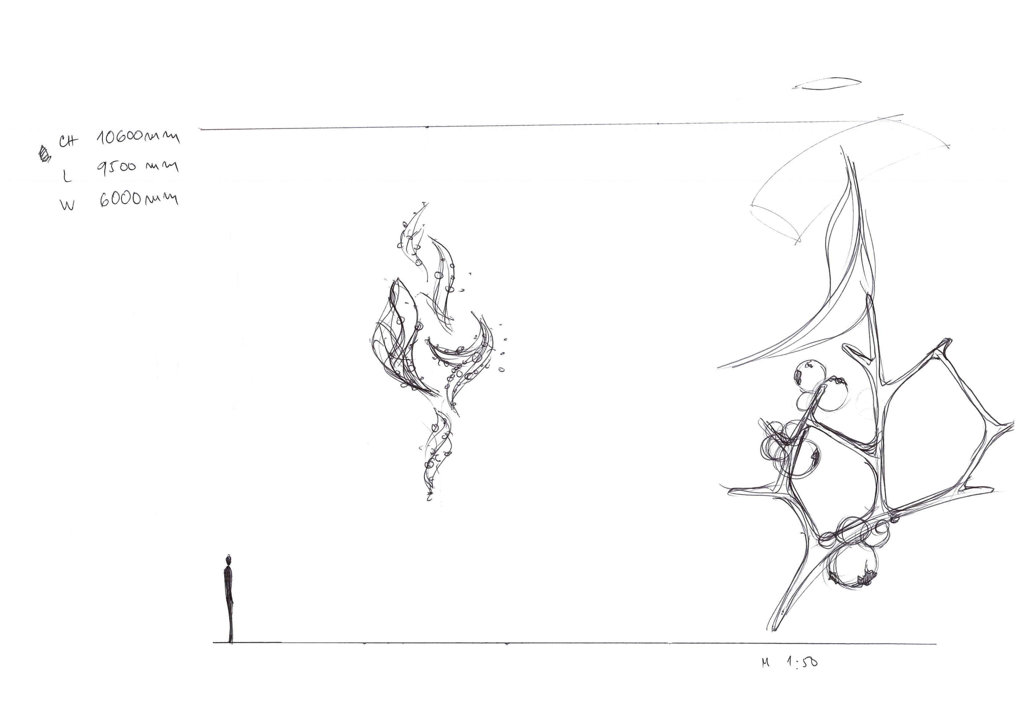 Floating above both sculptures are 128 slender glass drops — stylized rain suspended in air. Formed from crystal and amber glass with linear textures and fine air bubbles, they resemble the trace of water sliding down a window. As light passes through them, the imagined desert quietly begins to bloom.
