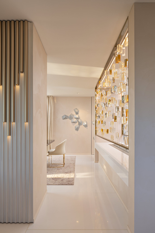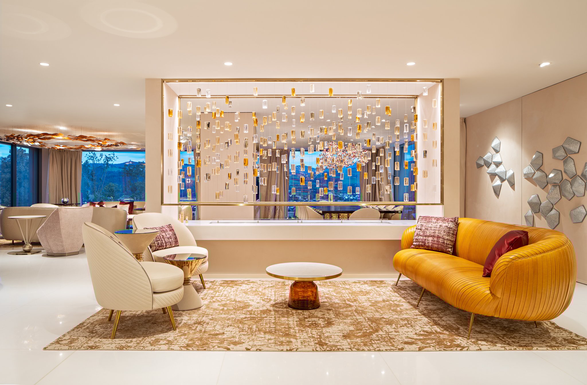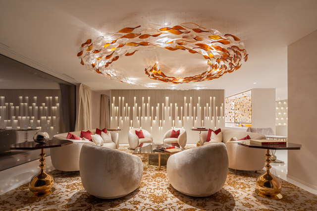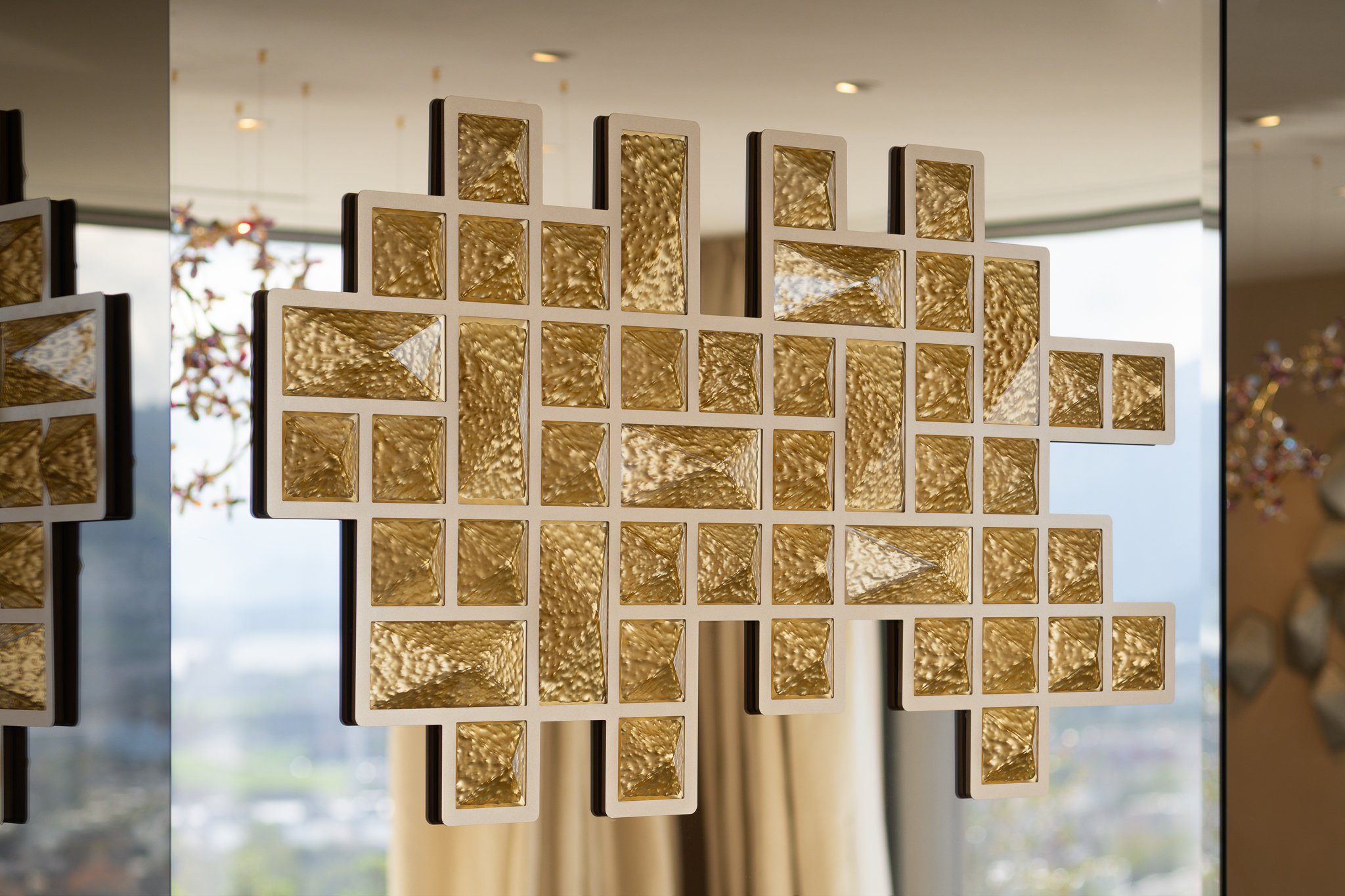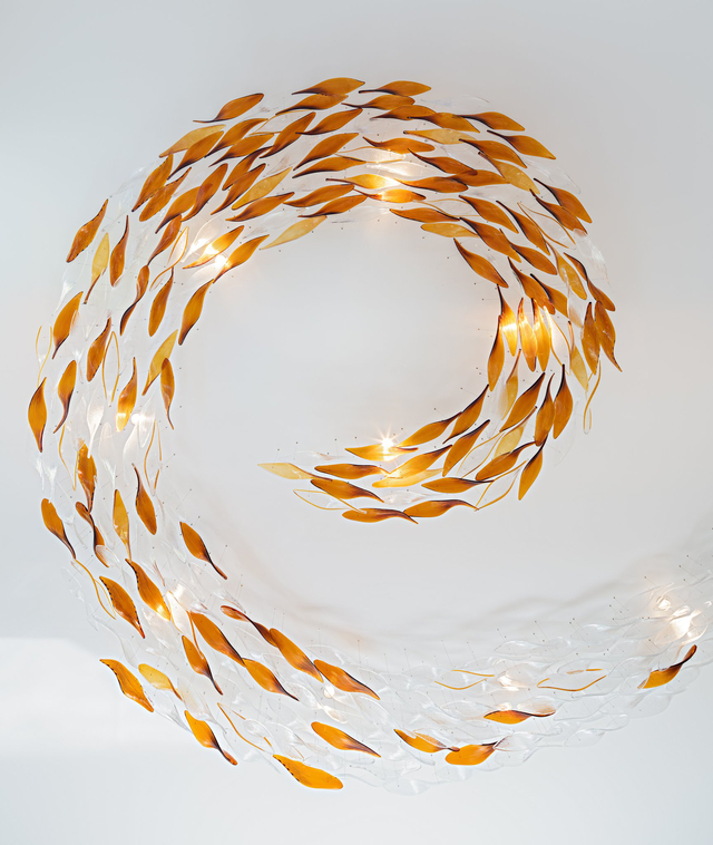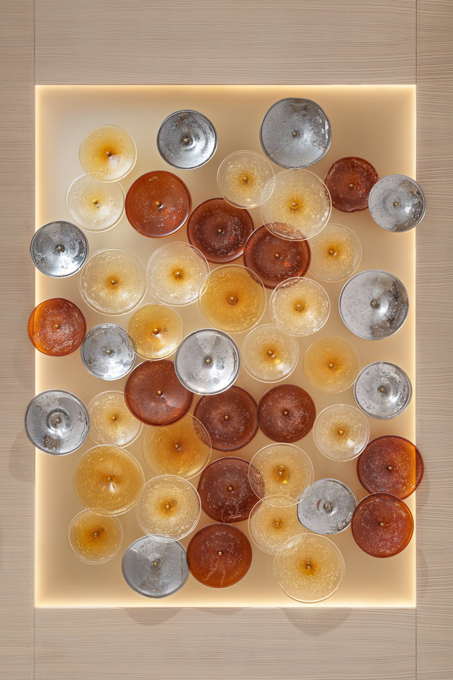 The sculpture draws from real desert flora — from chestnuts to pistachios — reimagined as a fictional plant that speaks to resilience. Over 400 handblown glass components in warm amber tones are set along 60 meters of sculpted golden branches. Each fruit differs slightly in tone, but all share the same story behind the light.