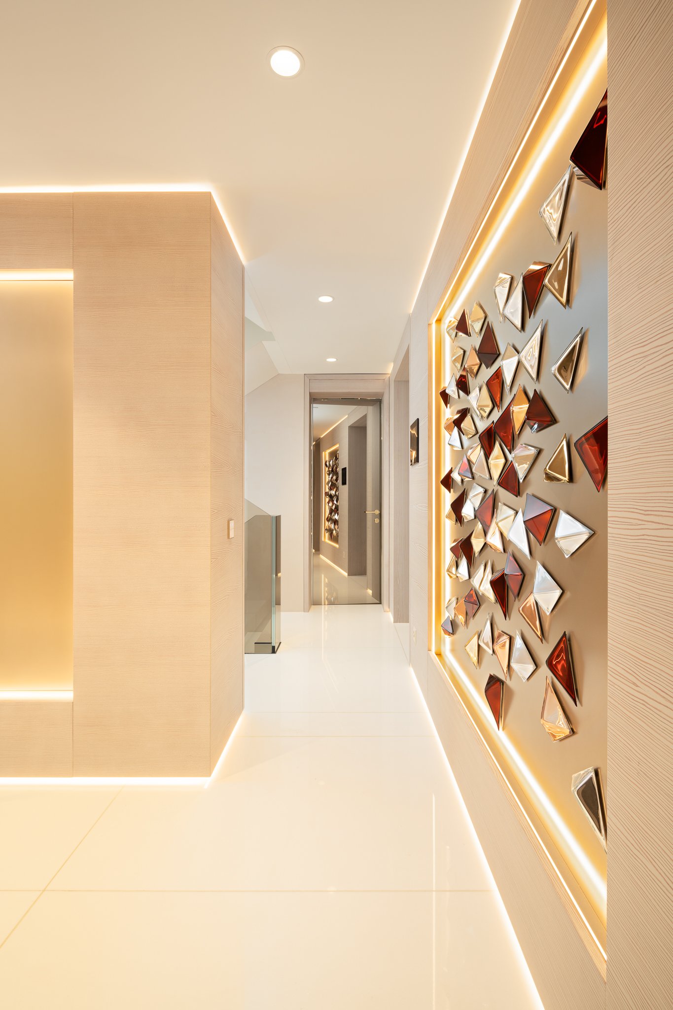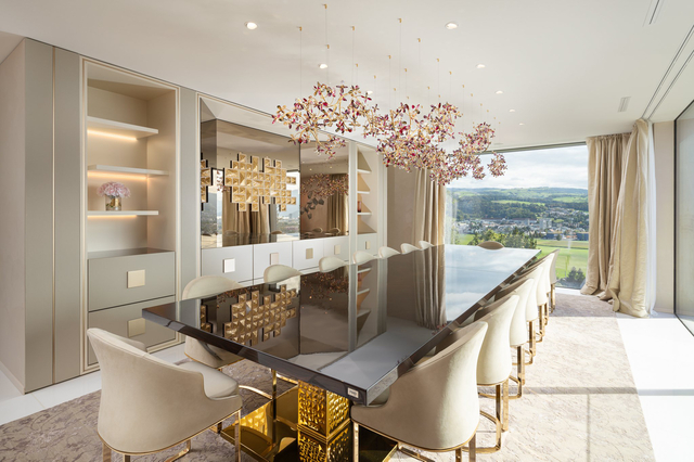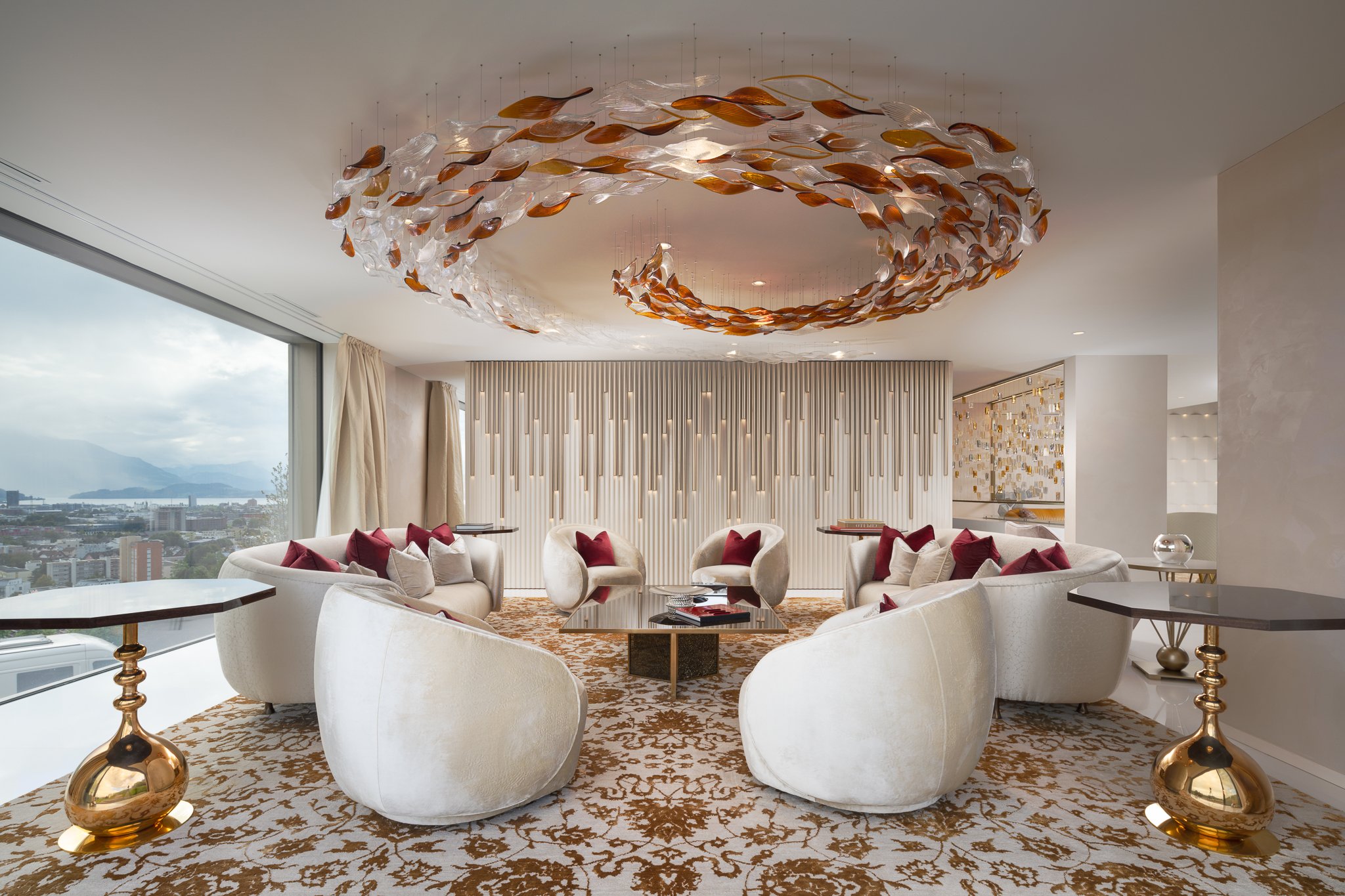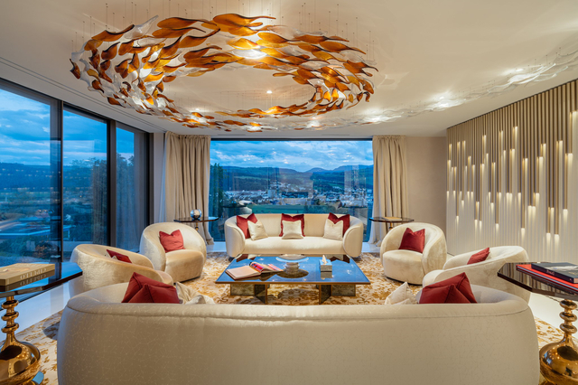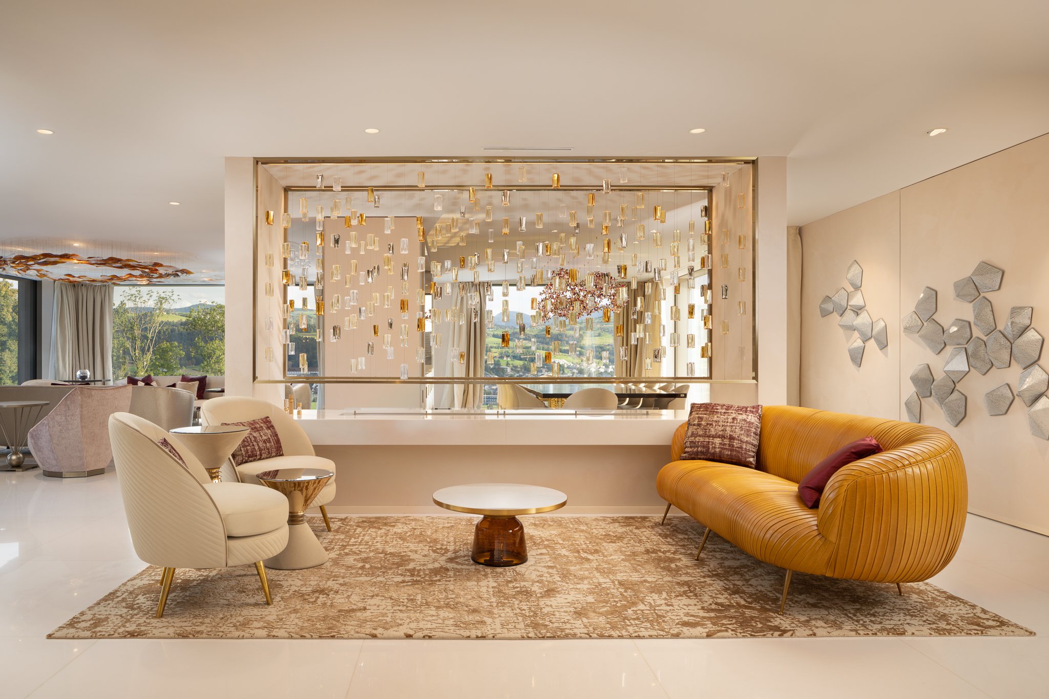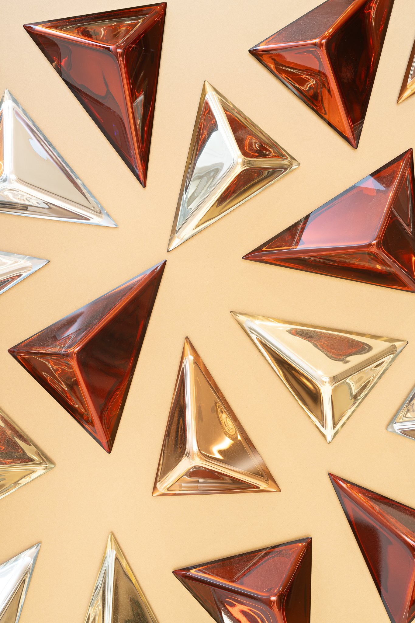 The sculpture draws from real desert flora — from chestnuts to pistachios — reimagined as a fictional plant that speaks to resilience. Over 400 handblown glass components in warm amber tones are set along 60 meters of sculpted golden branches. Each fruit differs slightly in tone, but all share the same story behind the light.