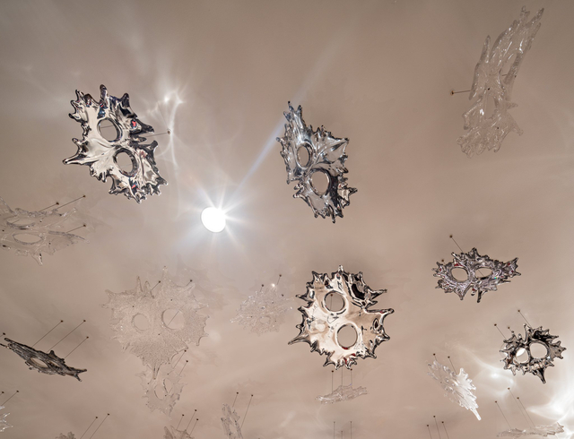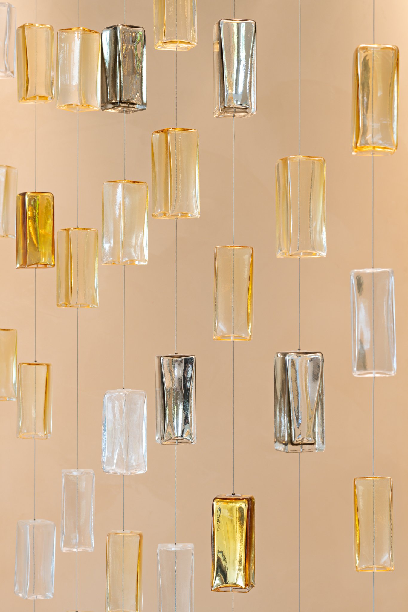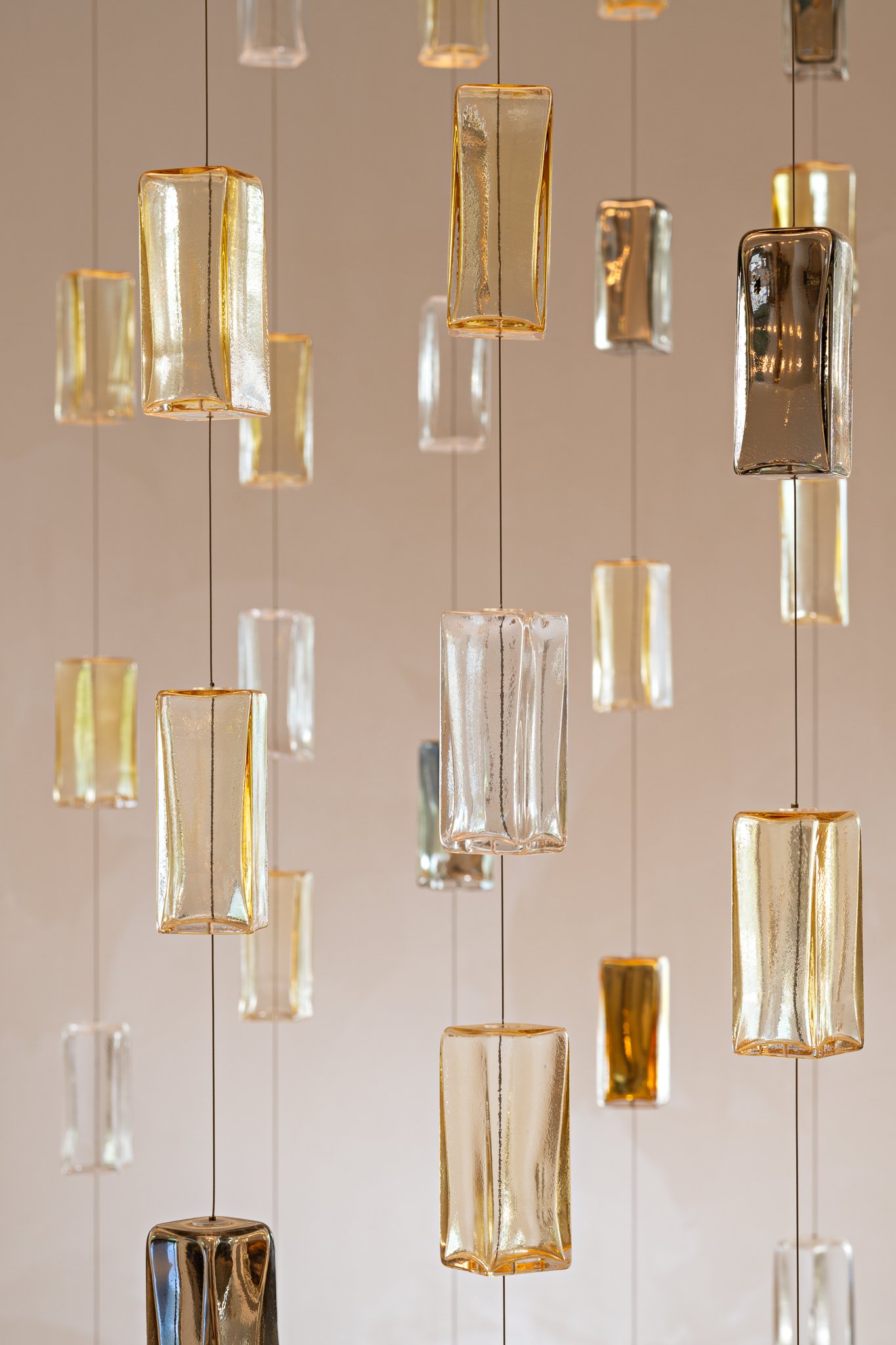Floating above both sculptures are 128 slender glass drops — stylized rain suspended in air. Formed from crystal and amber glass with linear textures and fine air bubbles, they resemble the trace of water sliding down a window. As light passes through them, the imagined desert quietly begins to bloom.