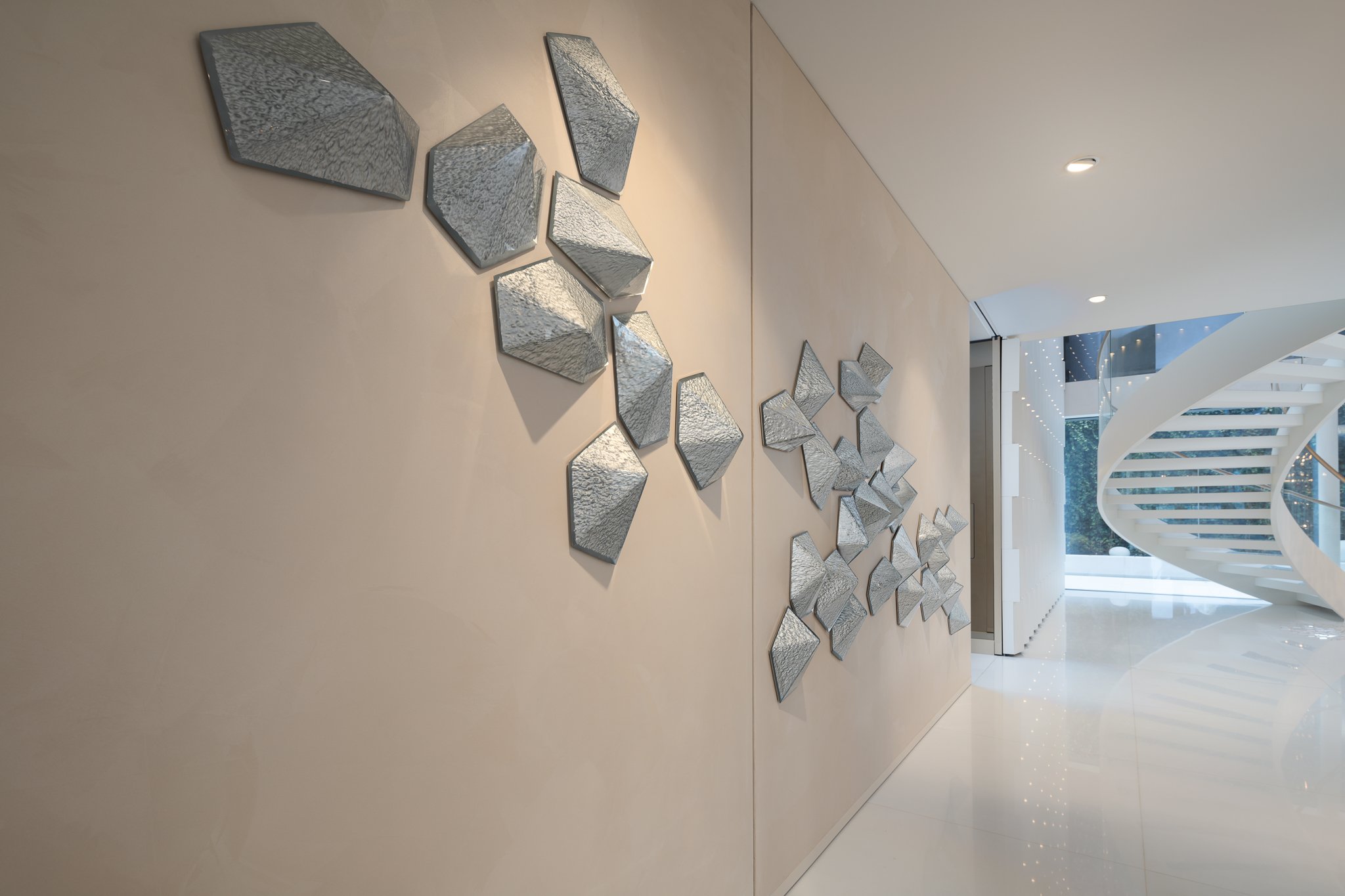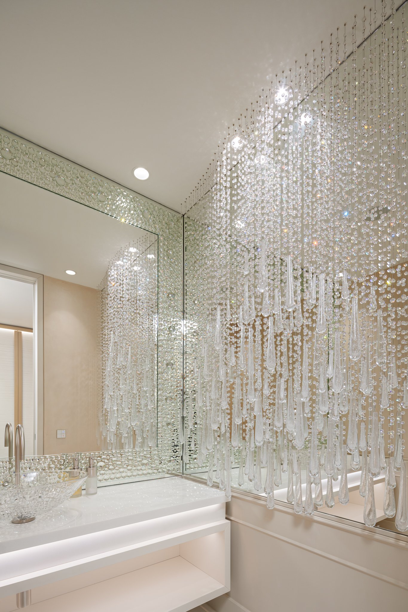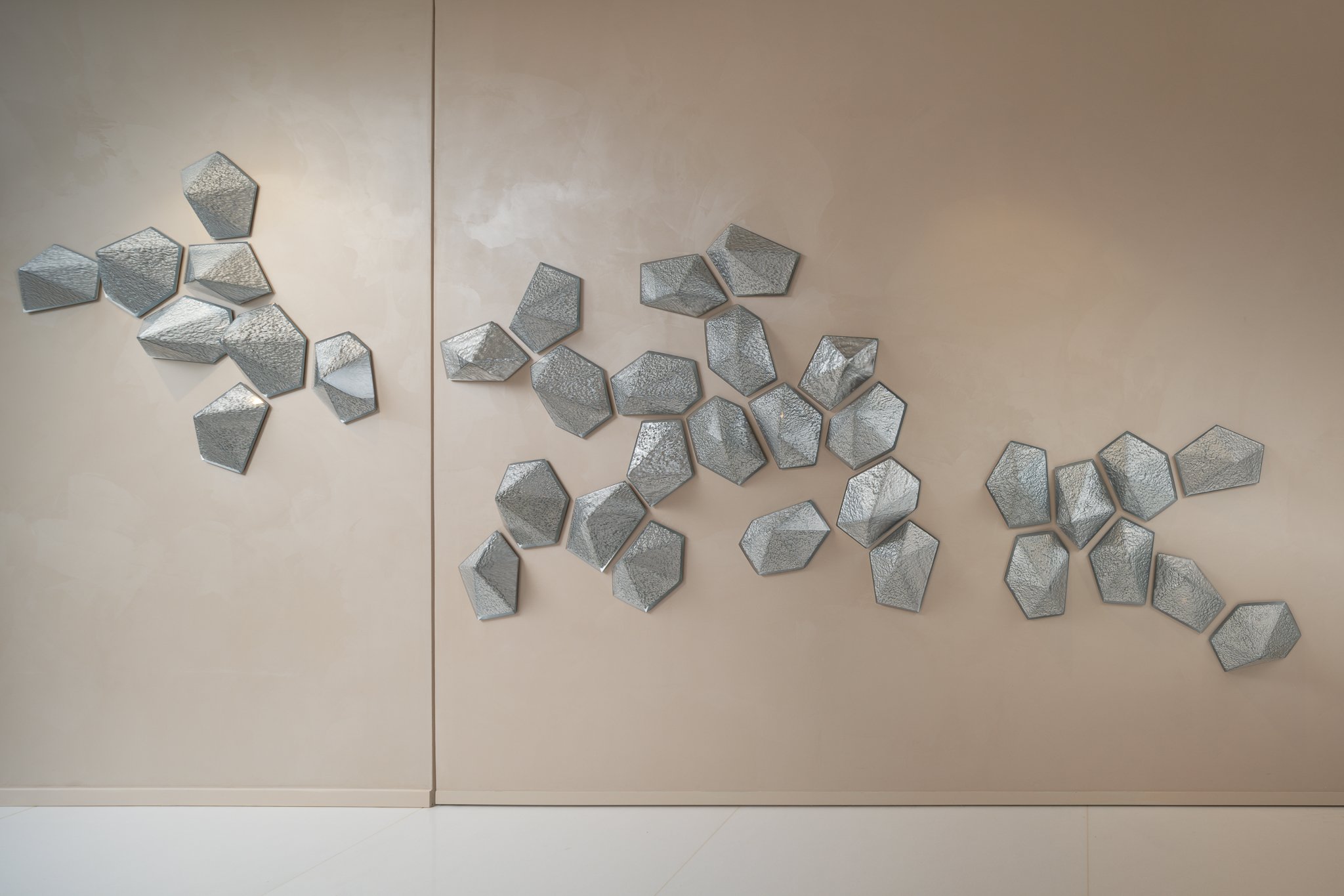 Floating above both sculptures are 128 slender glass drops — stylized rain suspended in air. Formed from crystal and amber glass with linear textures and fine air bubbles, they resemble the trace of water sliding down a window. As light passes through them, the imagined desert quietly begins to bloom.