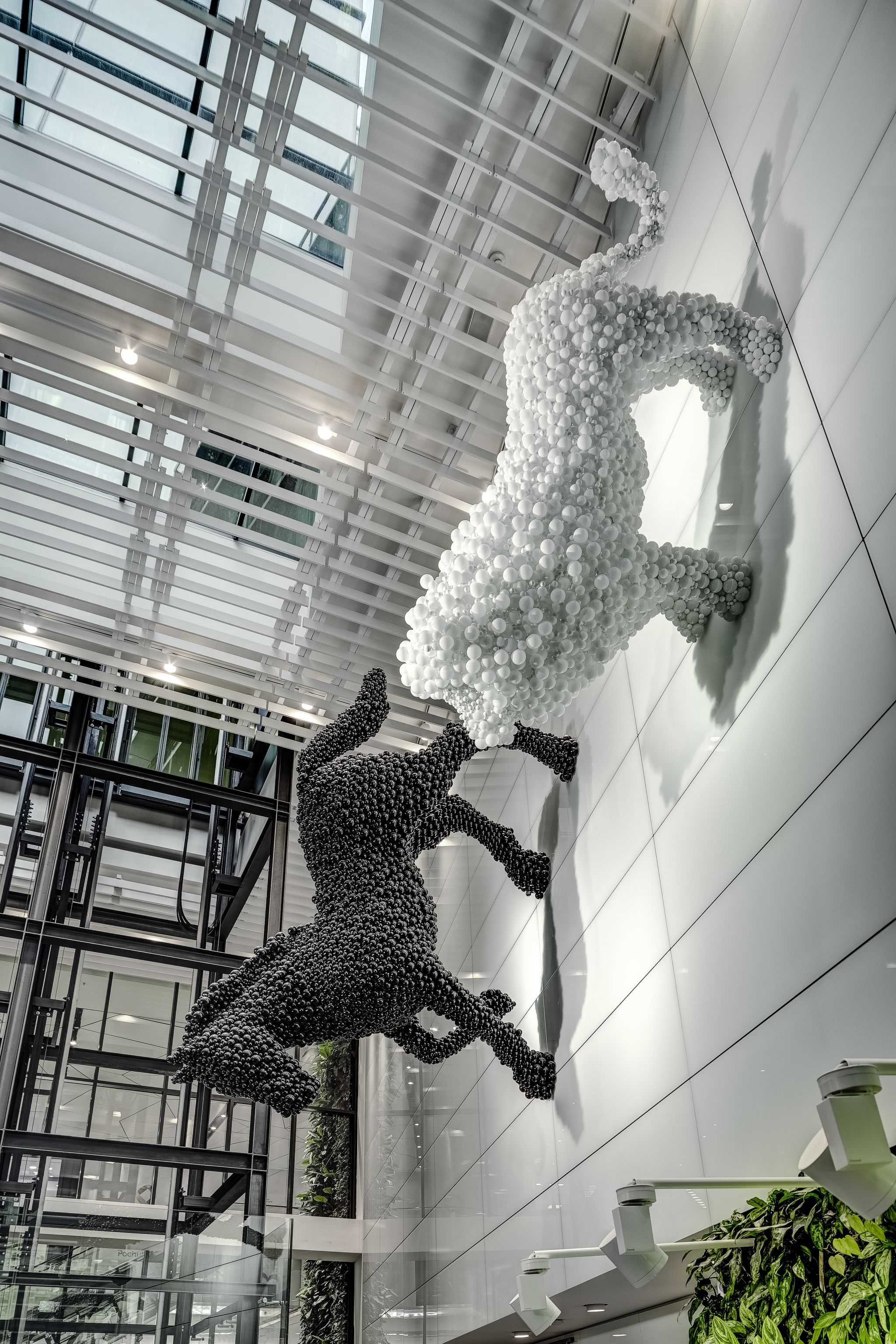 Maxim Velčovský’s piece deals with the topic of the spirit of the city, for which he created a glass statue for the hall of Quadrio reminiscent of the buildings that once stood in this place: the Black Horse, the White Lion and the White Shoe. They have disappeared over time, giving way to the city’s infrastructure. Individual glass statues were set with more than 10 000 black or opal hand-blown glass balls.