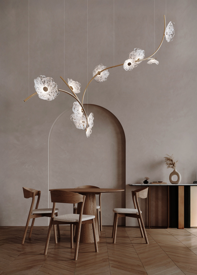 Rosa is a poetic lighting installation shaped by Lasvit’s ongoing glassmaking explorations. Created by designer Martin Gallo, Rosa draws from the quiet determination of climbing plants—those that seek light in slow, graceful motion. The design captures this instinct to grow, reaching upward with sculptural lines and luminous presence.