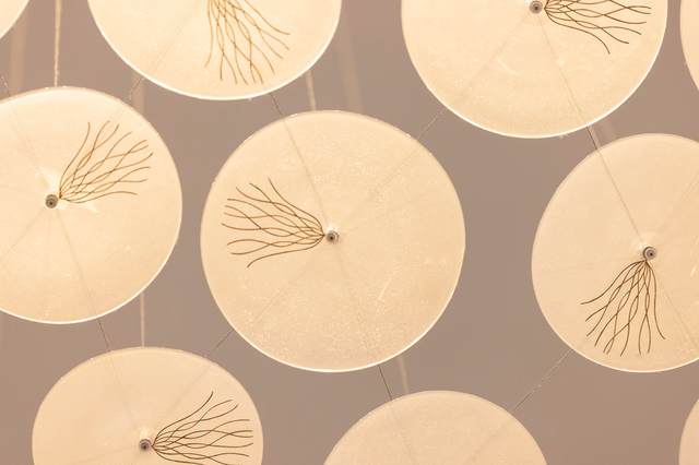 Gleam draws on the wardrobe of Caroline Astor, the self appointed gatekeeper of New York elite society. Her gold embroidered gowns defined the visual language of the era. The installation is formed from cast glass plates, each marked with hand painted gold lines that recall embroidery, catching light and creating a luminous, layered composition.